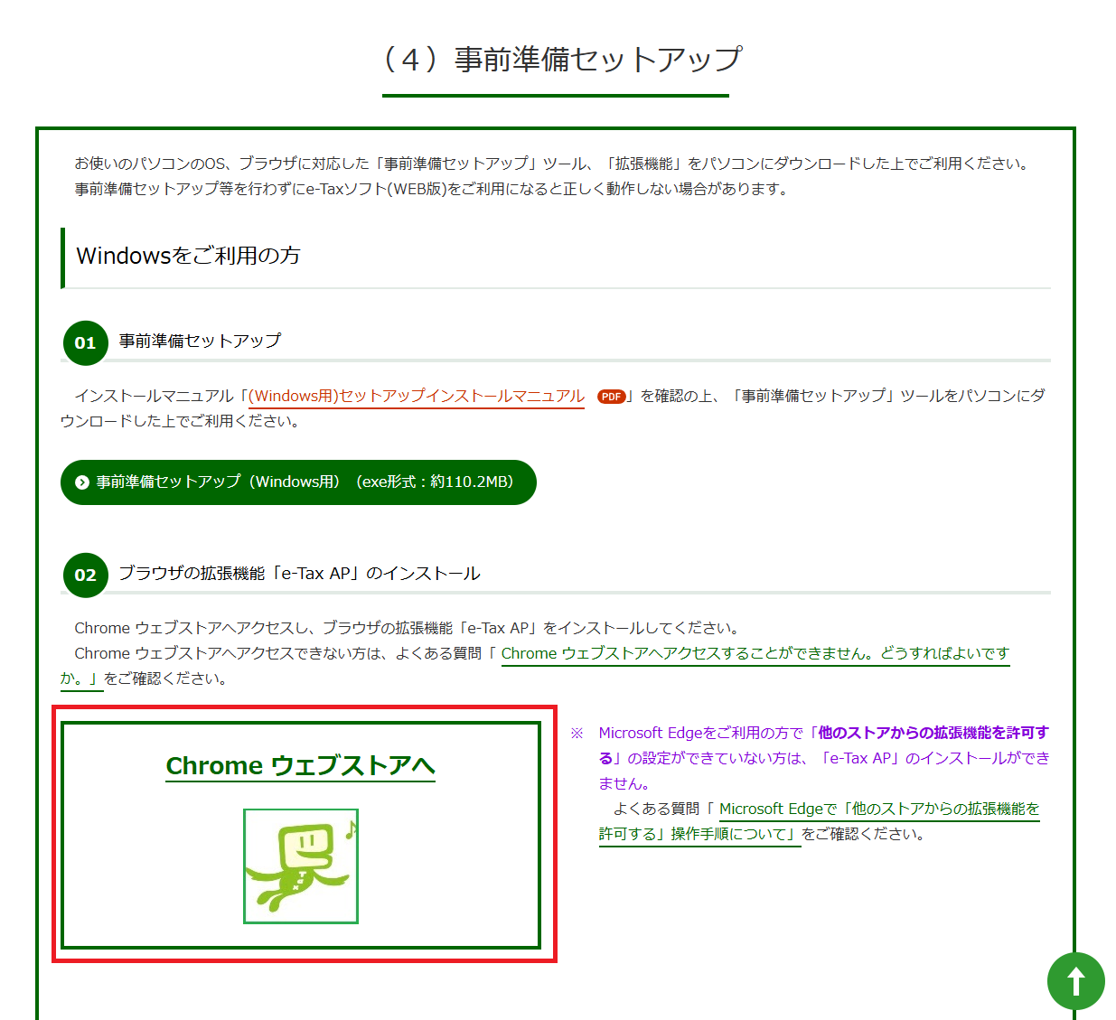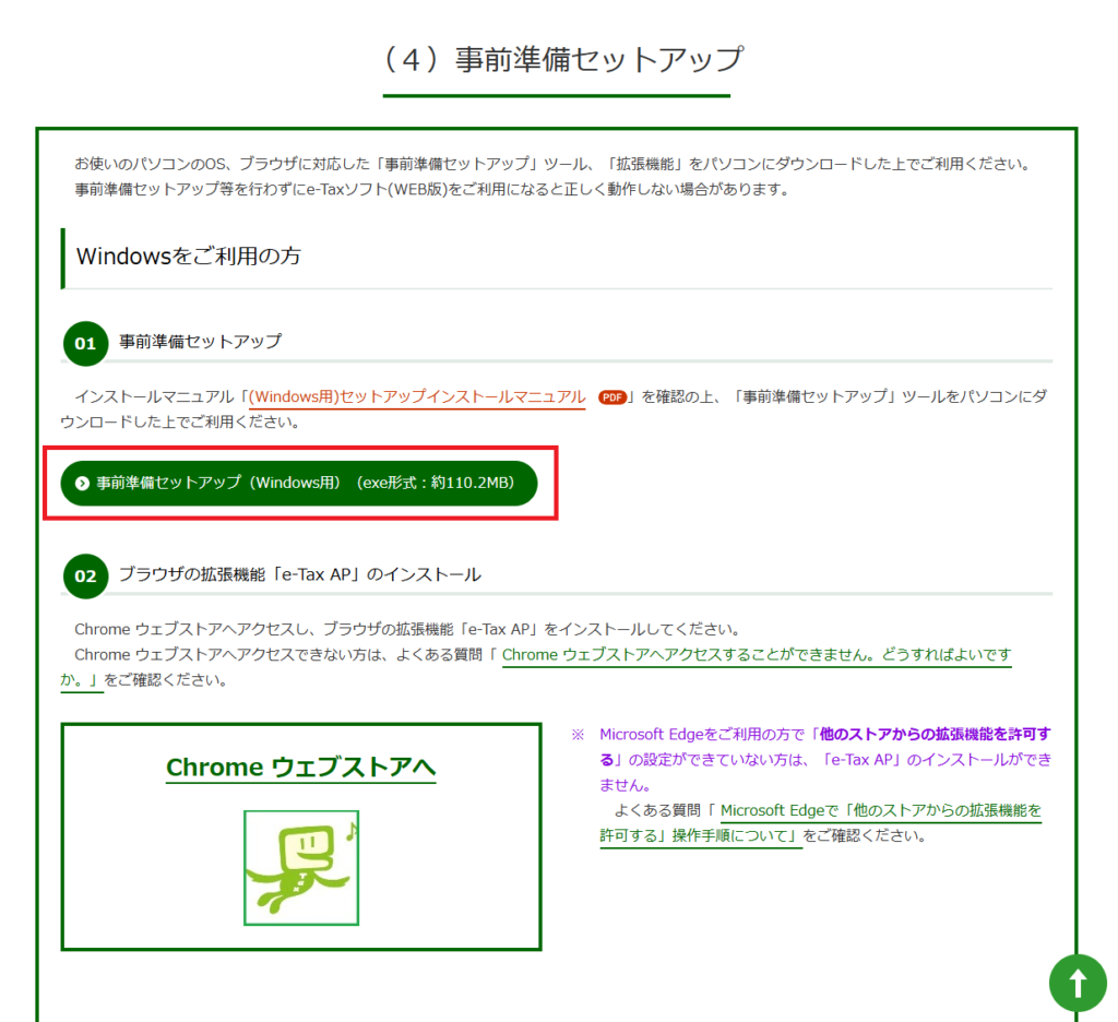 この「e-Taxソフト(Web版)」というシステムを使えるようにするために「事前準備セットアップ」と「拡張機能の追加」をする必要があります。