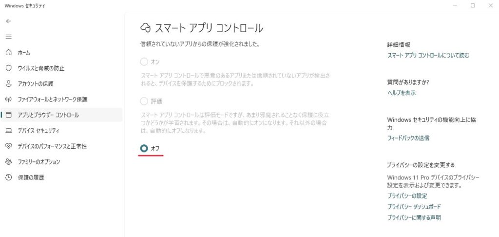 ※スマートアプリコントロールの設定を一度OFFにすると、 あとからONに戻すことはできません。(2026/3時点)